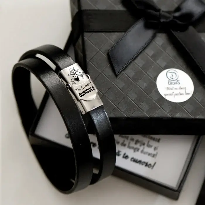 bunicul tău, oferindu-i un accesoriu unic și plin de semnificație. Brățara poate fi inscripționată cu mesaje speciale din variantele noastre, pentru a-i arăta bunicului cât de mult înseamnă pentru tine. Mesajul poate fi completat cu un simbol la alegere, selectat din lista de simboluri disponibile în galeria noastră de poze. Indiferent de ocazie, această brățară este un mod minunat de a-i face un cadou personalizat și de a-l surprinde cu un detaliu plin de iubire și respect.